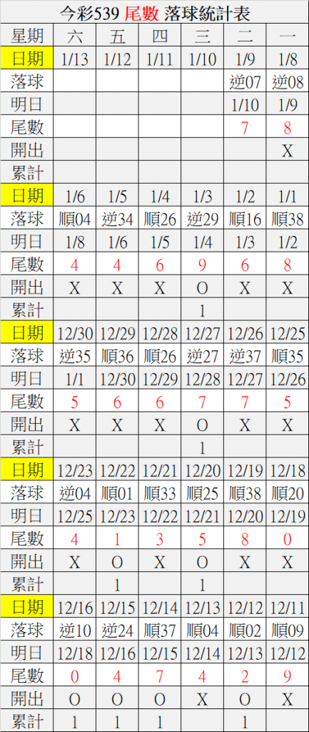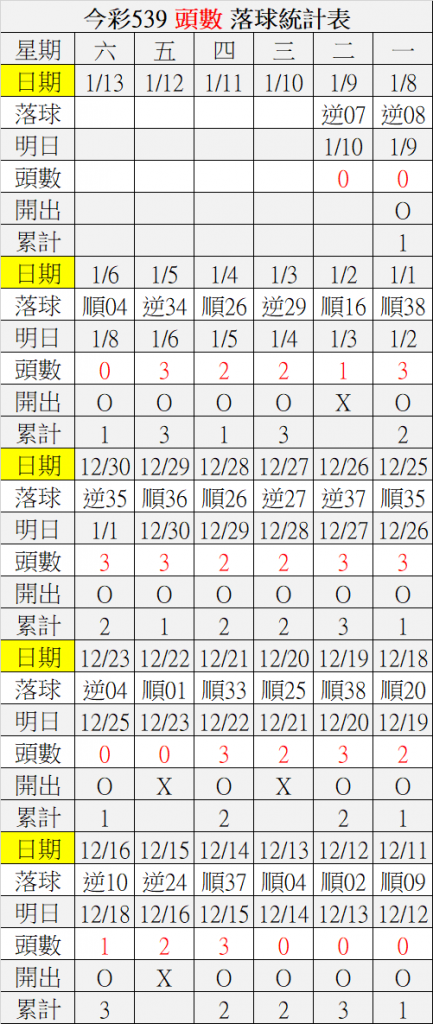 1/10 今彩539 落球順序表