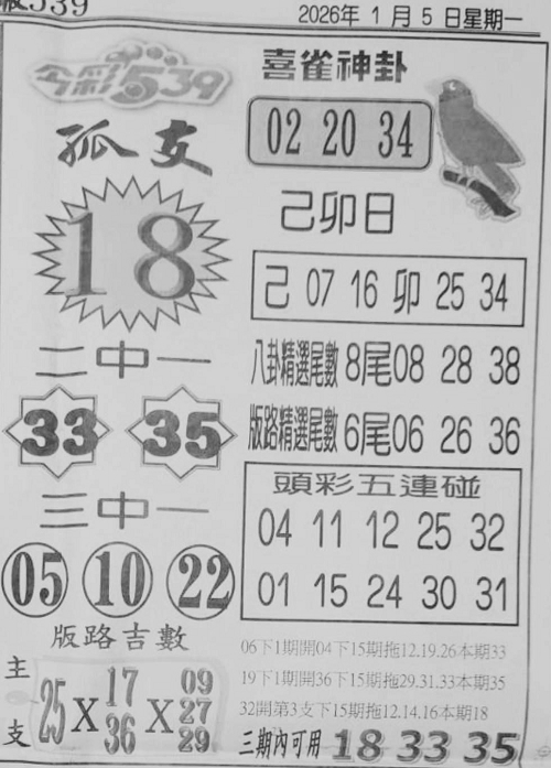 1/5 今彩539 台北鐵報