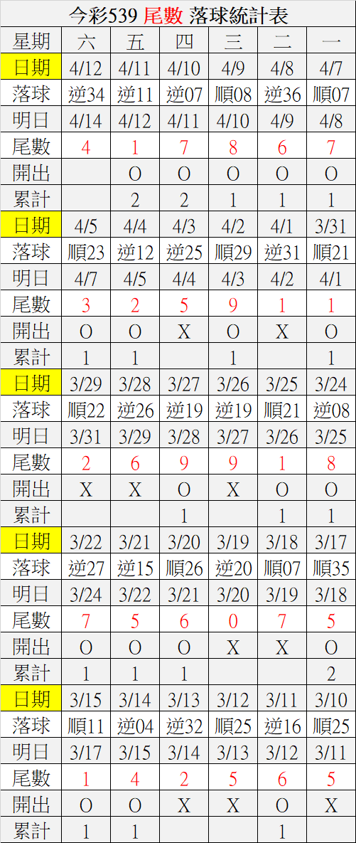 4/14 今彩539 落球順序表