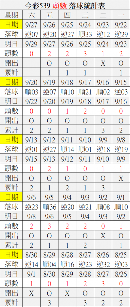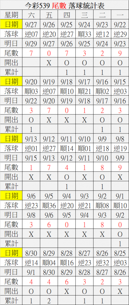 9/29 今彩539 落球順序表