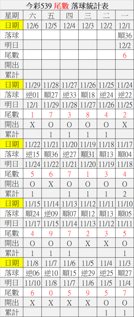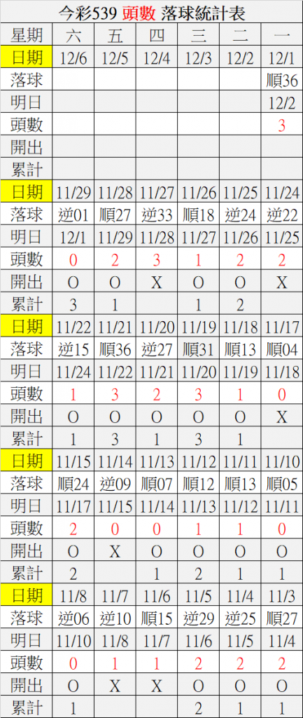 12/2 今彩539 落球順序表
