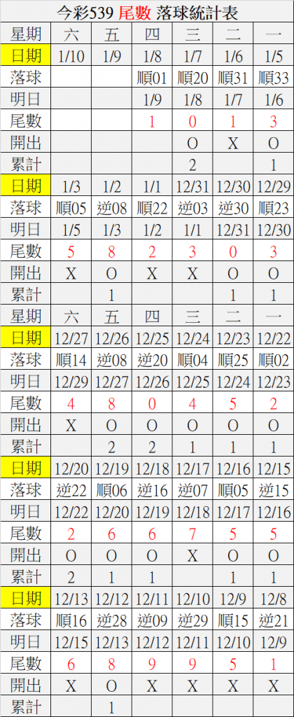 1/9 今彩539 落球順序表