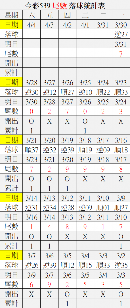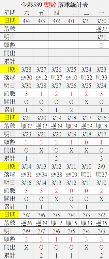 3/31 今彩539 落球順序表