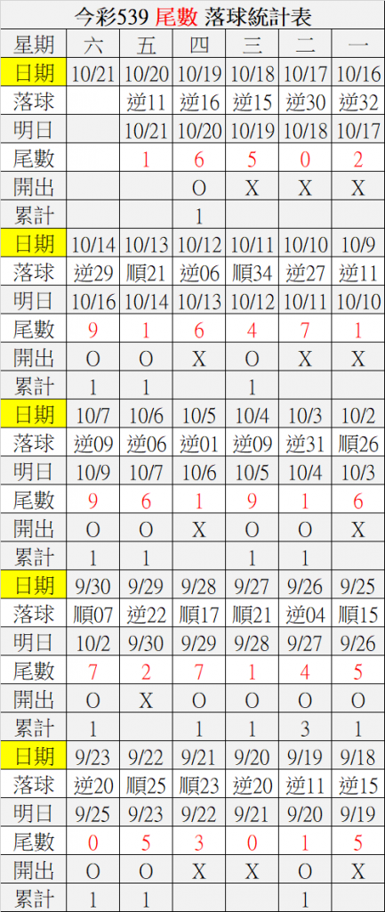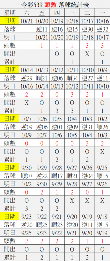 10/21 今彩539 落球順序表