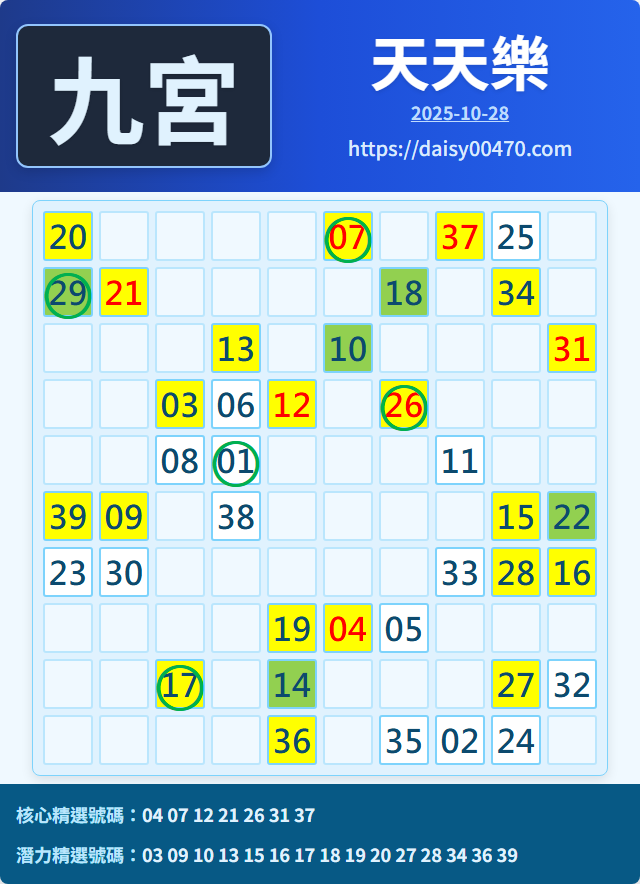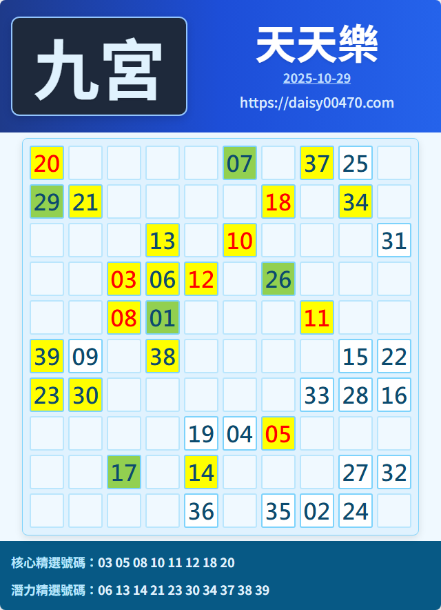 10/29 天天樂 九宮 精選 高機牌 合牌參考