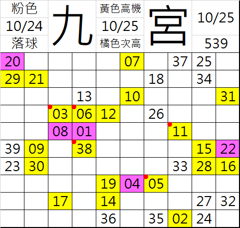 10/25 今彩539 九宮 精選 高低機牌 合牌參考