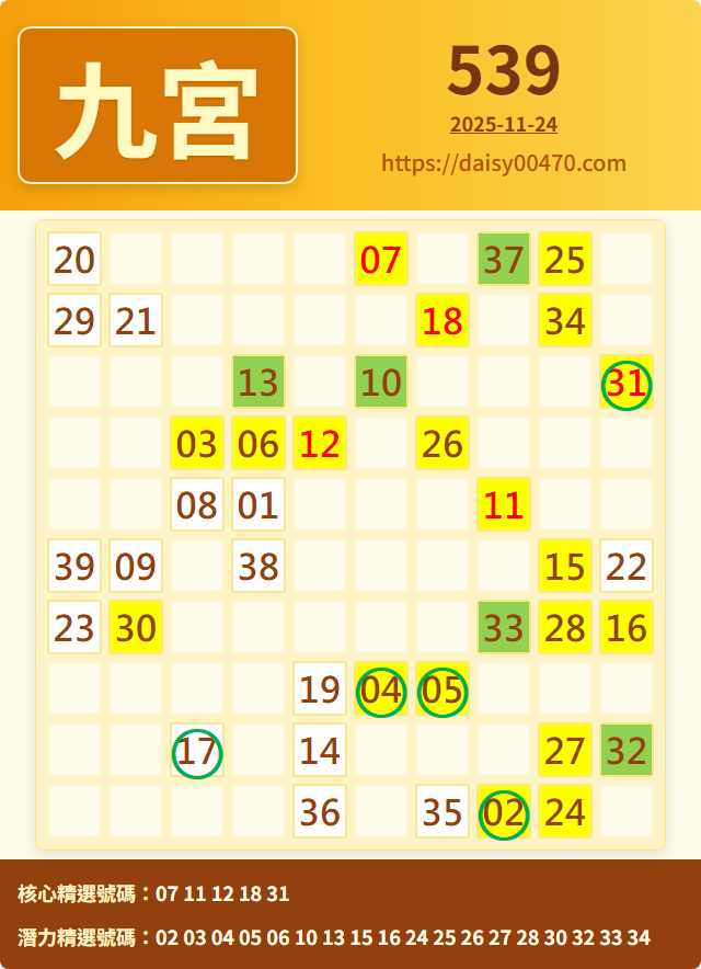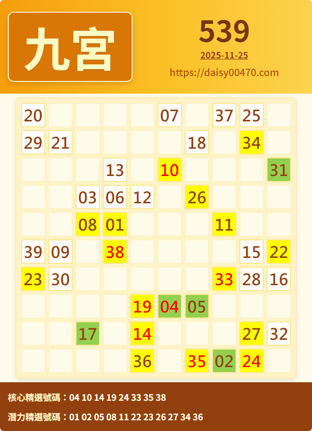 11/25 今彩539 九宮 精選 高機牌 合牌參考