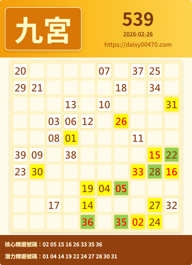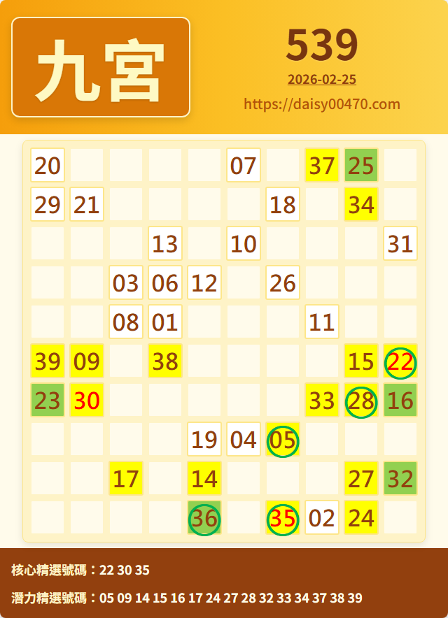 2/26 今彩539 九宮 精選 高機牌 合牌參考