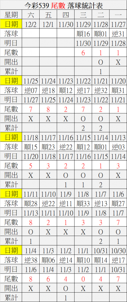 11/30 今彩539 落球順序表