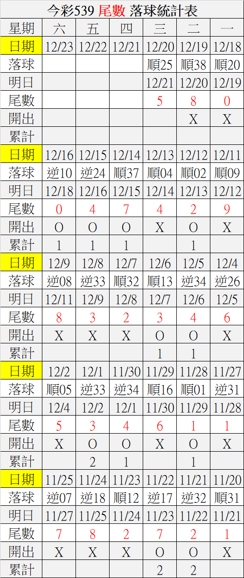 12/21 今彩539 落球順序表