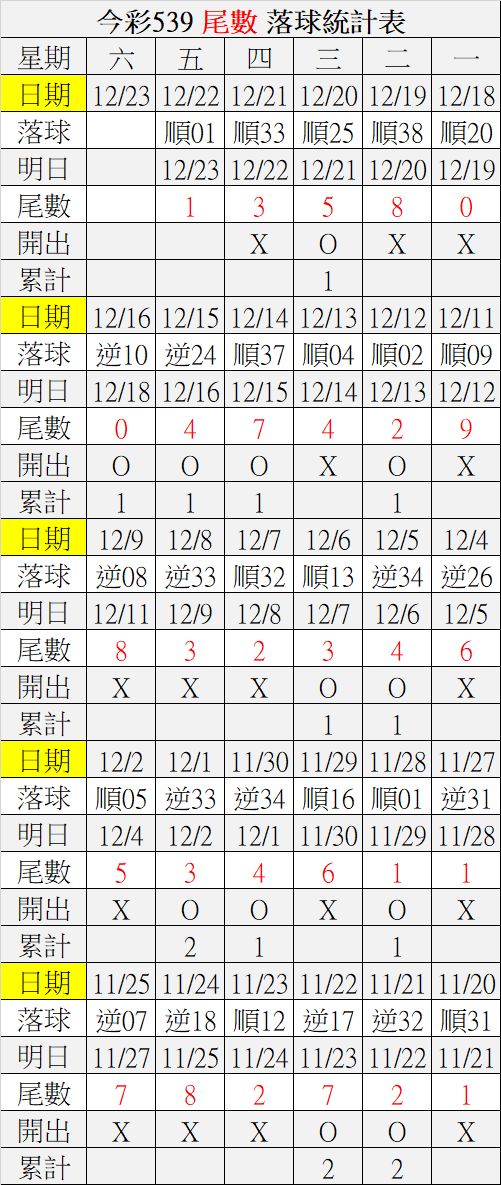 12/23 今彩539 落球順序表