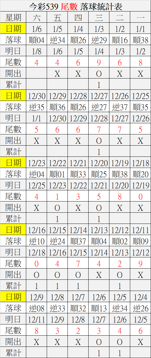 1/8 今彩539 落球順序表