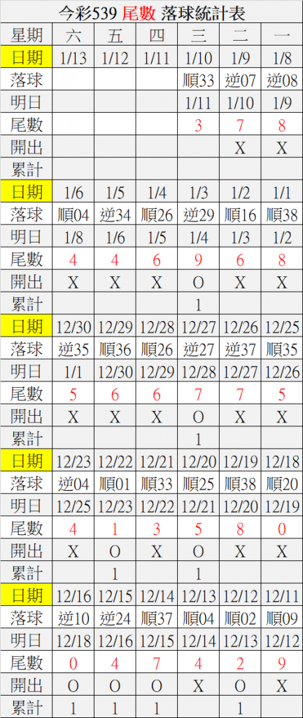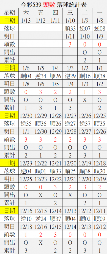 1/11 今彩539 落球順序表