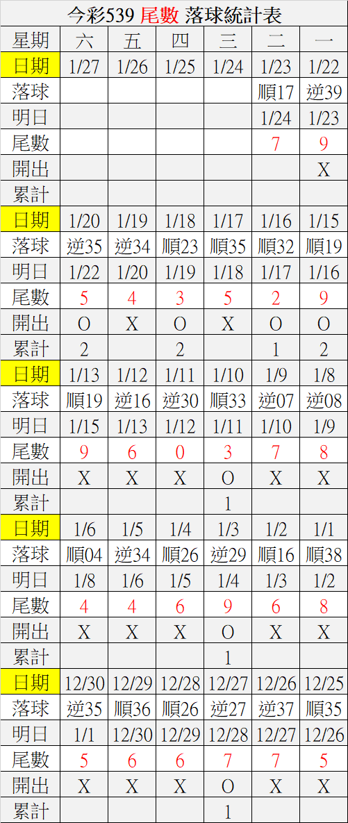 1/24 今彩539 落球順序表