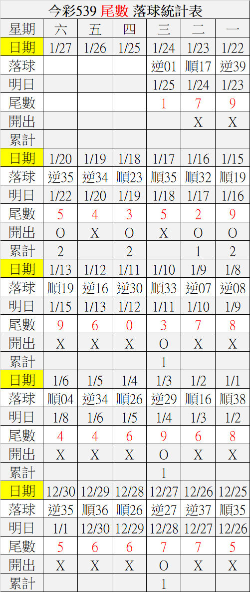 1/25 今彩539 落球順序表