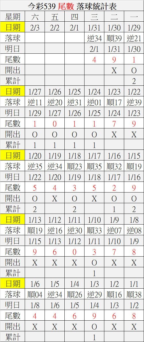2/1 今彩539 落球順序表