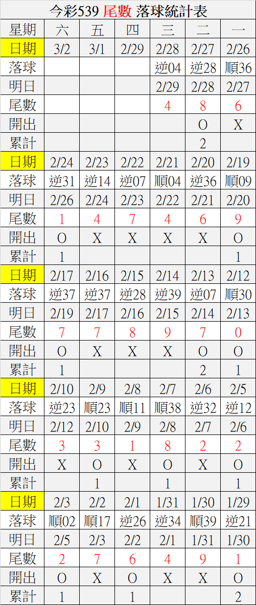 2/29 今彩539 落球順序表