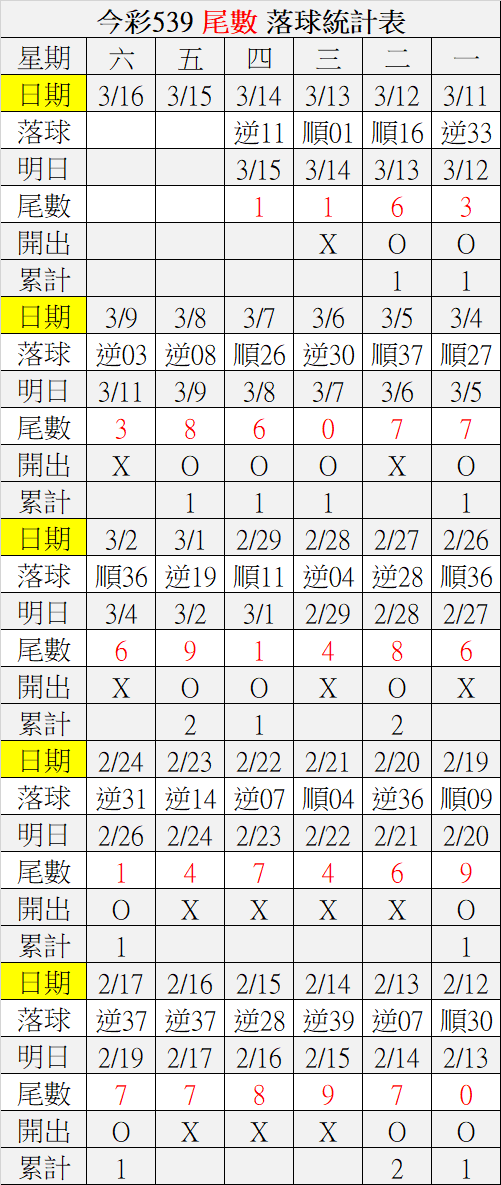 3/15 今彩539 落球順序表