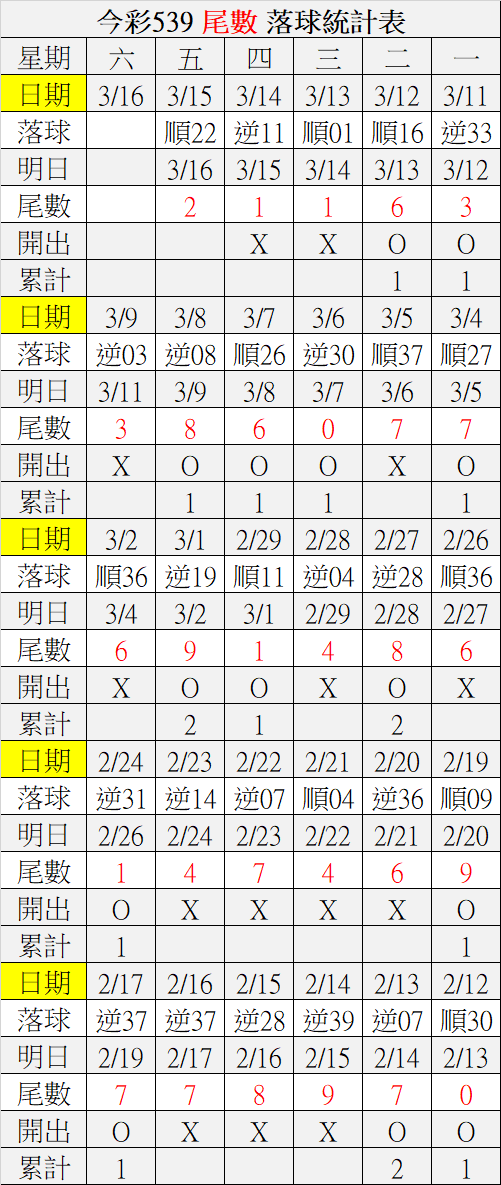 3/16 今彩539 落球順序表