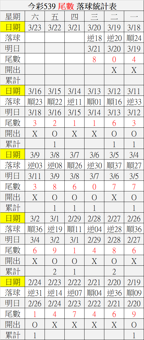 3/21 今彩539 落球順序表