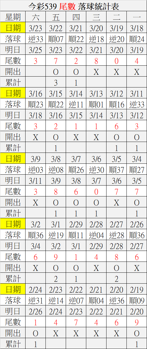 3/25 今彩539 落球順序表