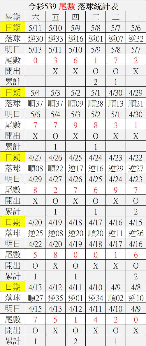 5/13 今彩539 落球順序表