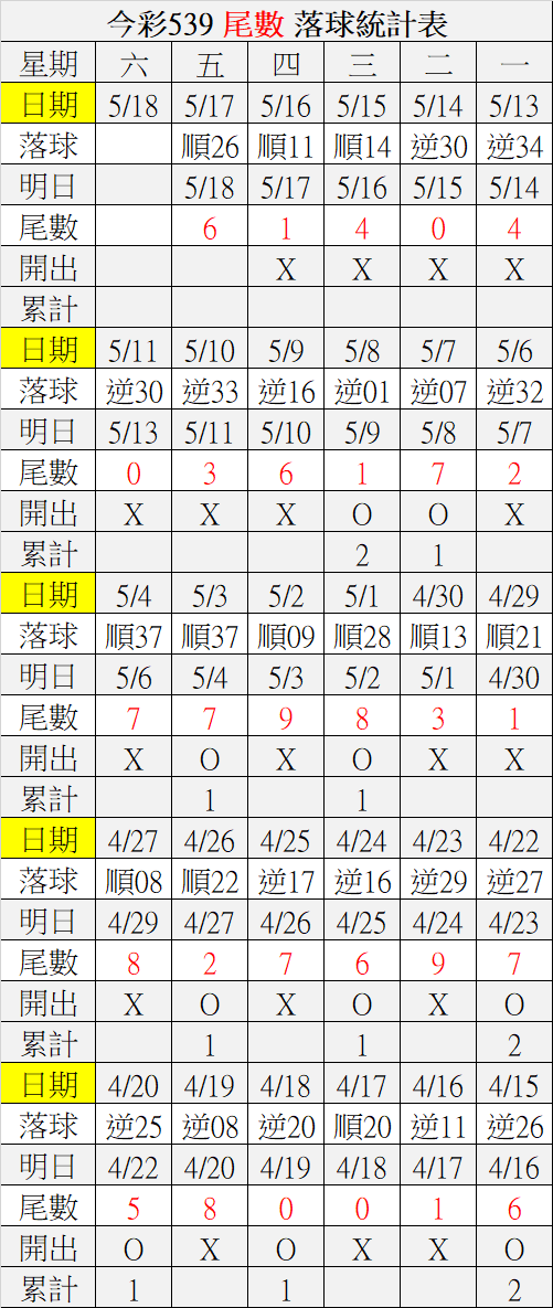 5/18 今彩539 落球順序表