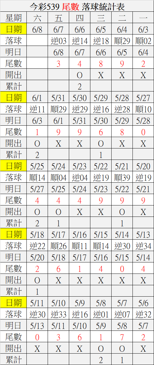 6/8 今彩539 落球順序表