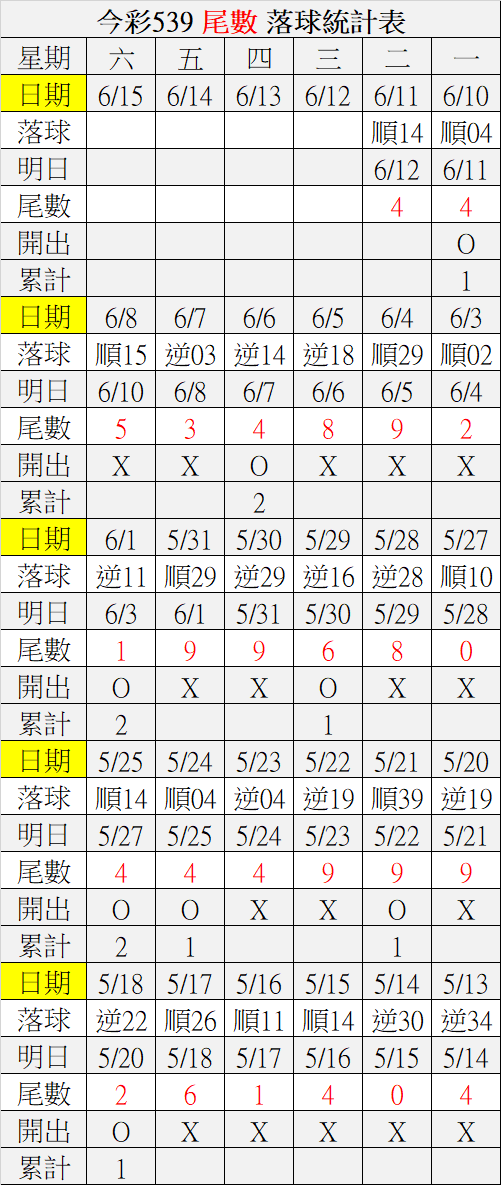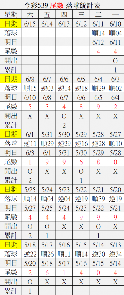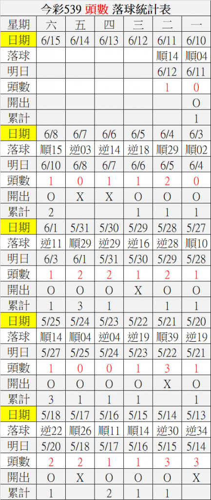 6/12 今彩539 落球順序表