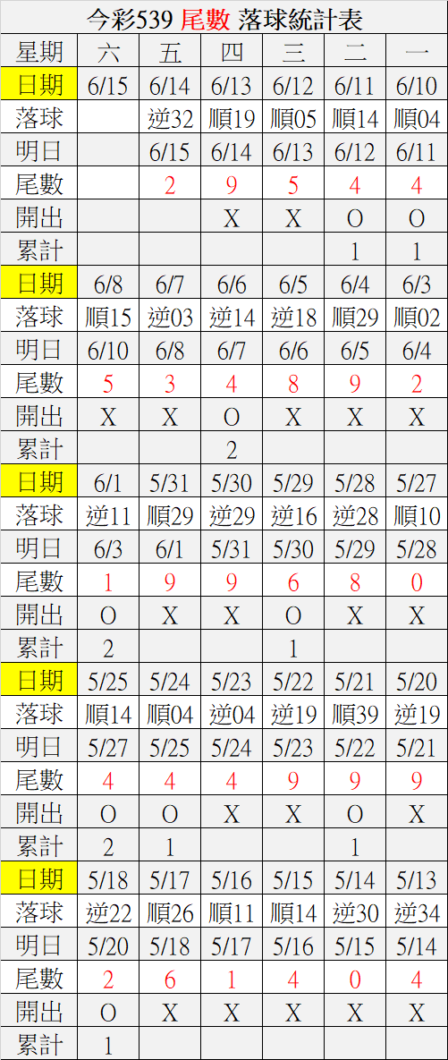 6/15 今彩539 落球順序表
