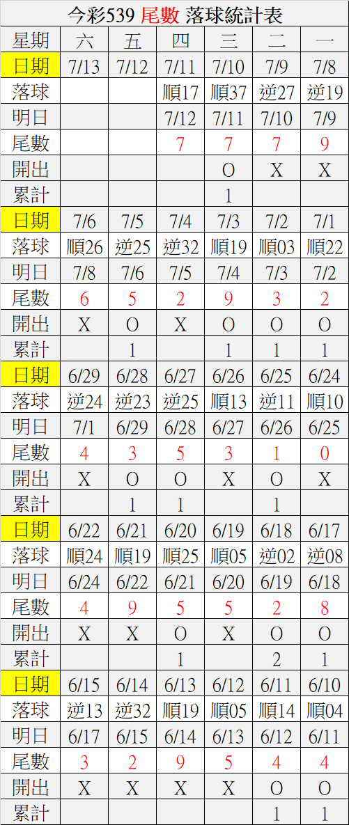 7/12 今彩539 落球順序表