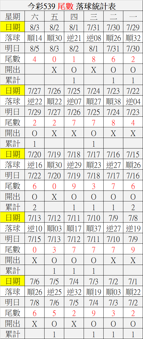 8/5 今彩539 落球順序表