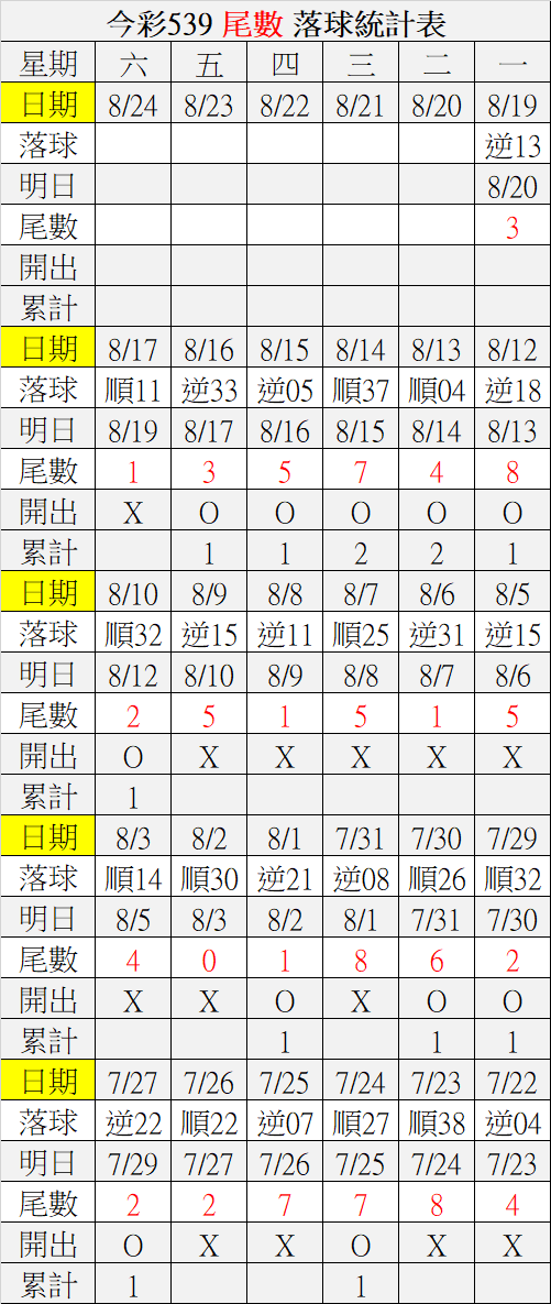 8/20 今彩539 落球順序表