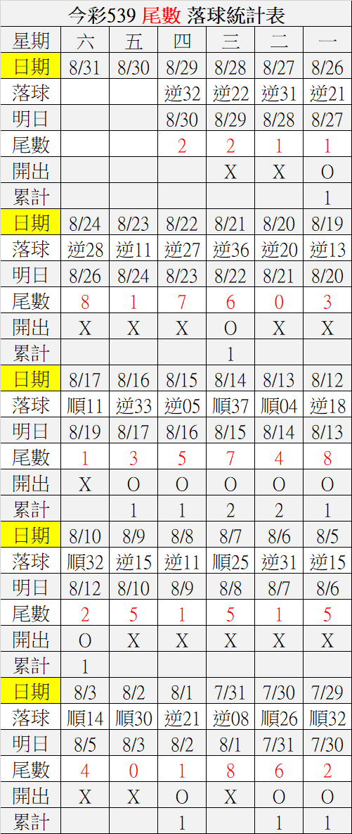 8/30 今彩539 落球順序表