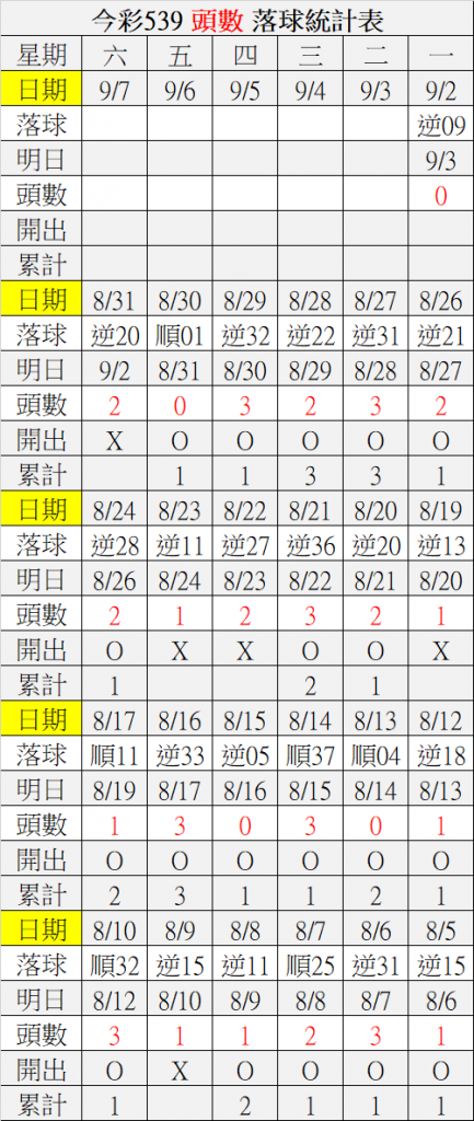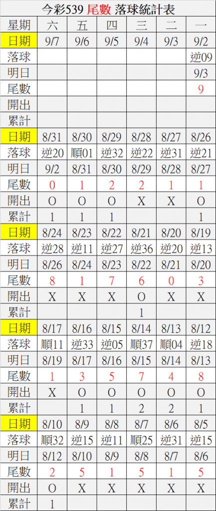 9/3 今彩539 落球順序表