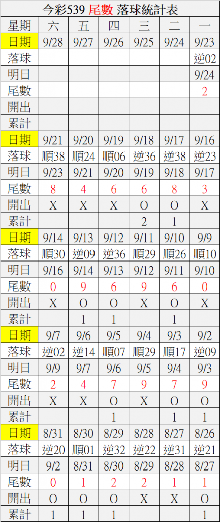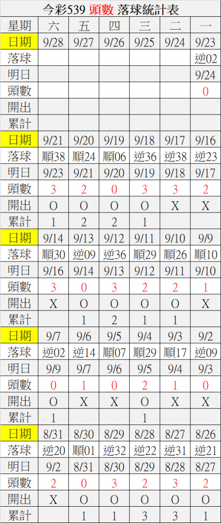 9/24 今彩539 落球順序表