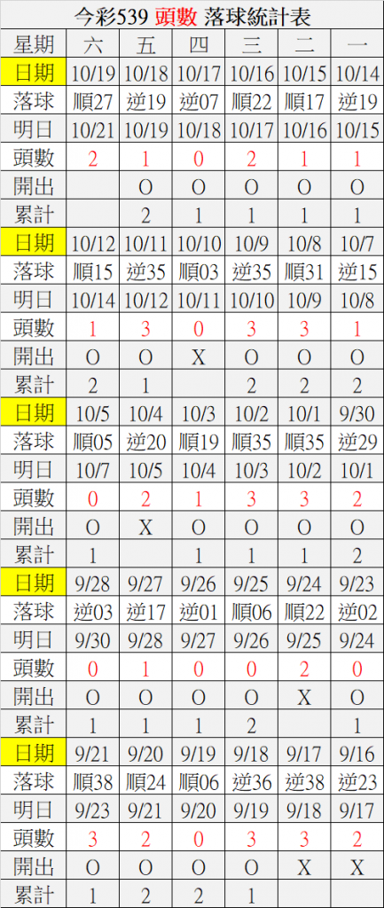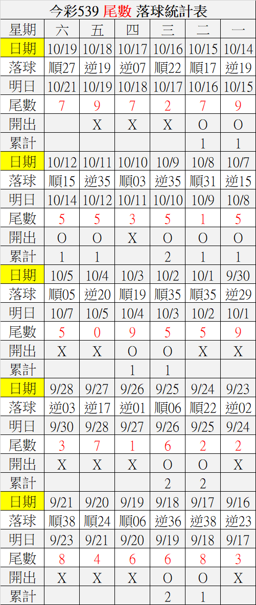 10/21 今彩539 落球順序表