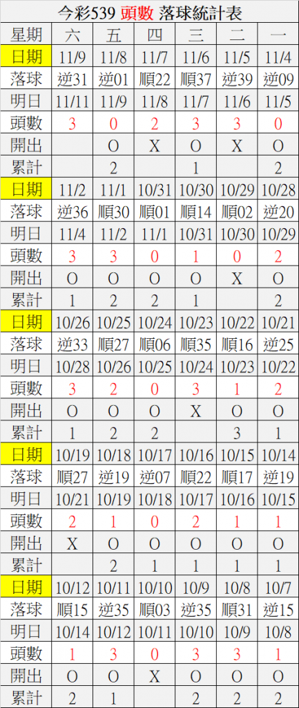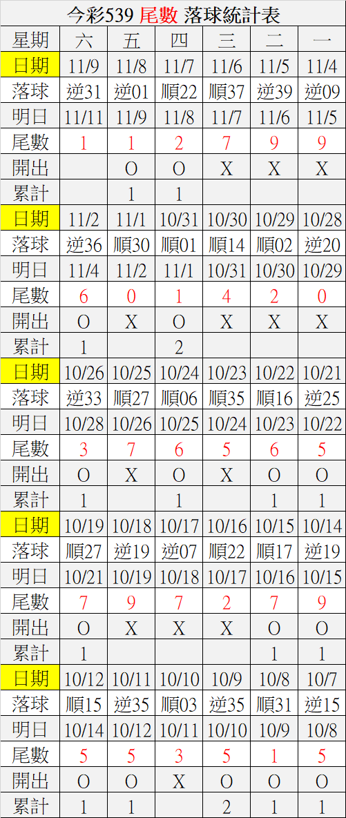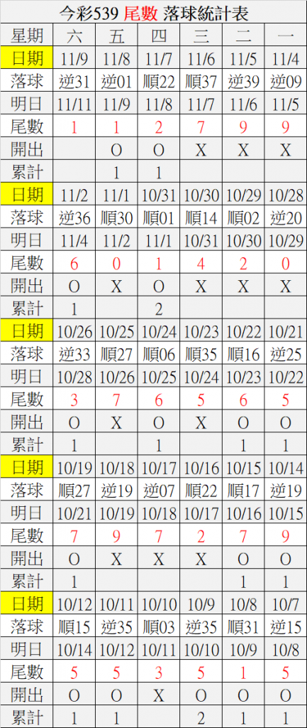11/11 今彩539 落球順序表