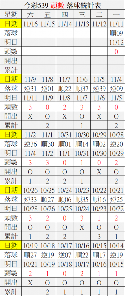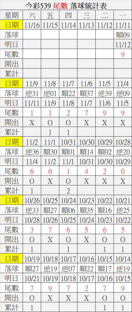 11/12 今彩539 落球順序表