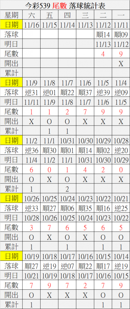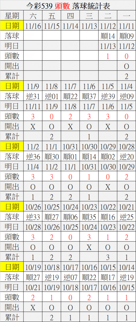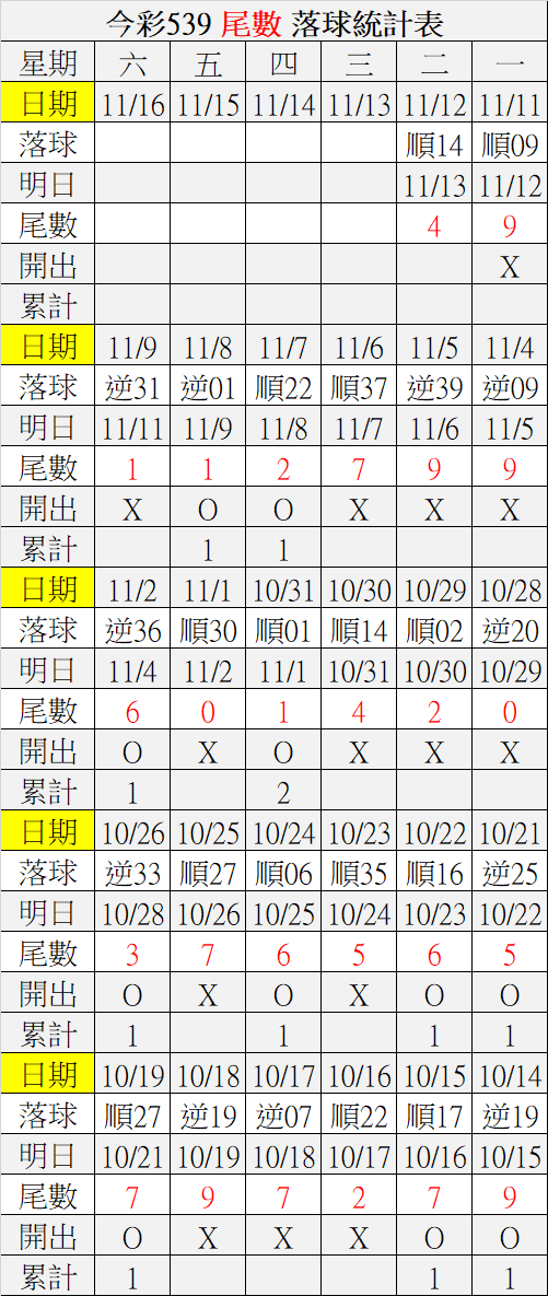 11/13 今彩539 落球順序表