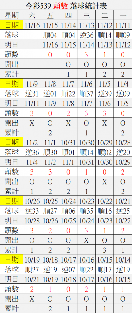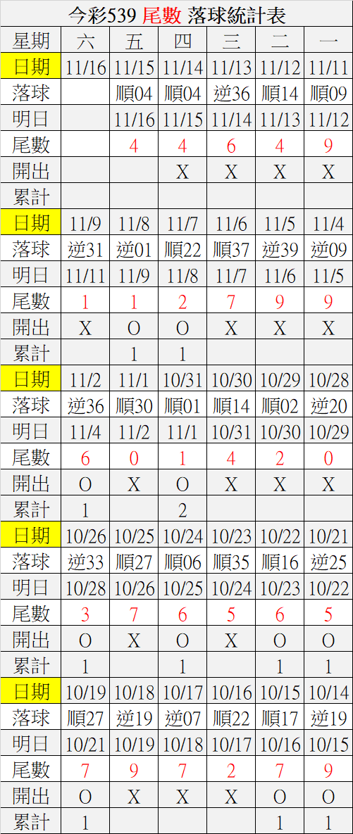 11/16 今彩539 落球順序表
