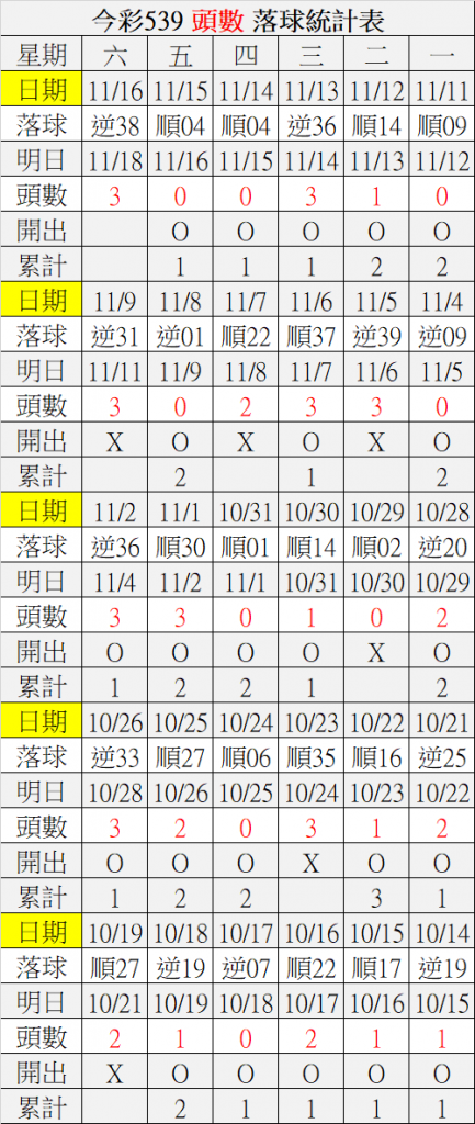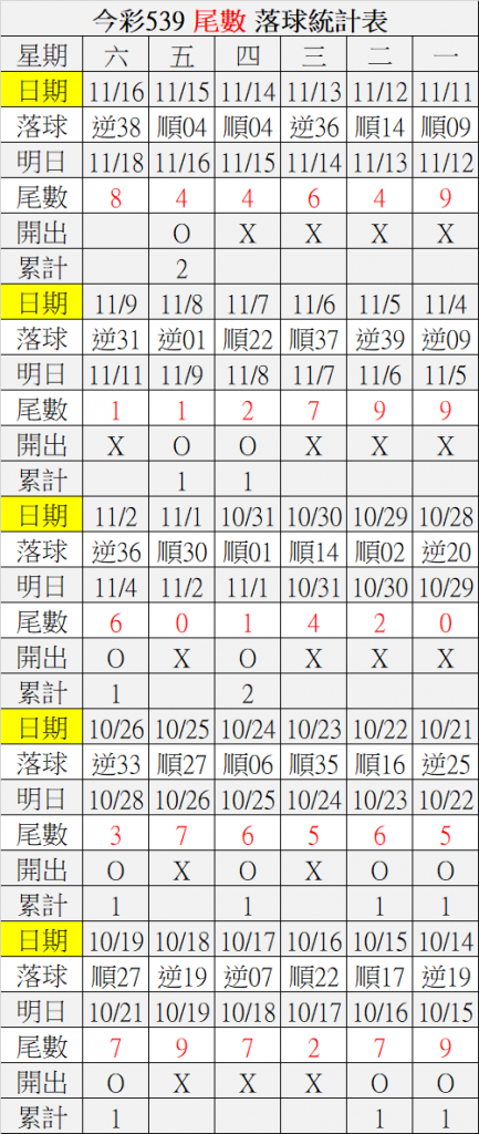 11/18 今彩539 落球順序表