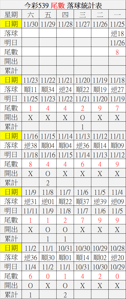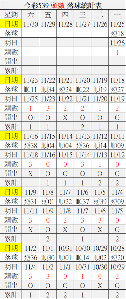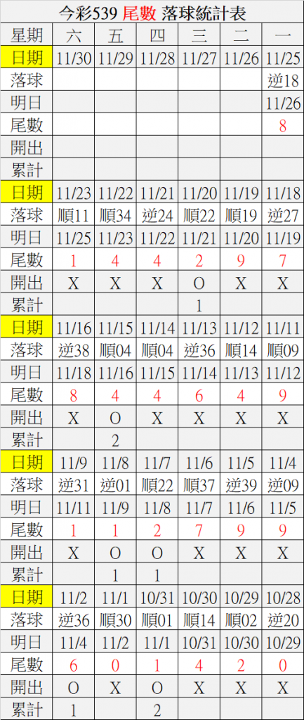 11/26 今彩539 落球順序表