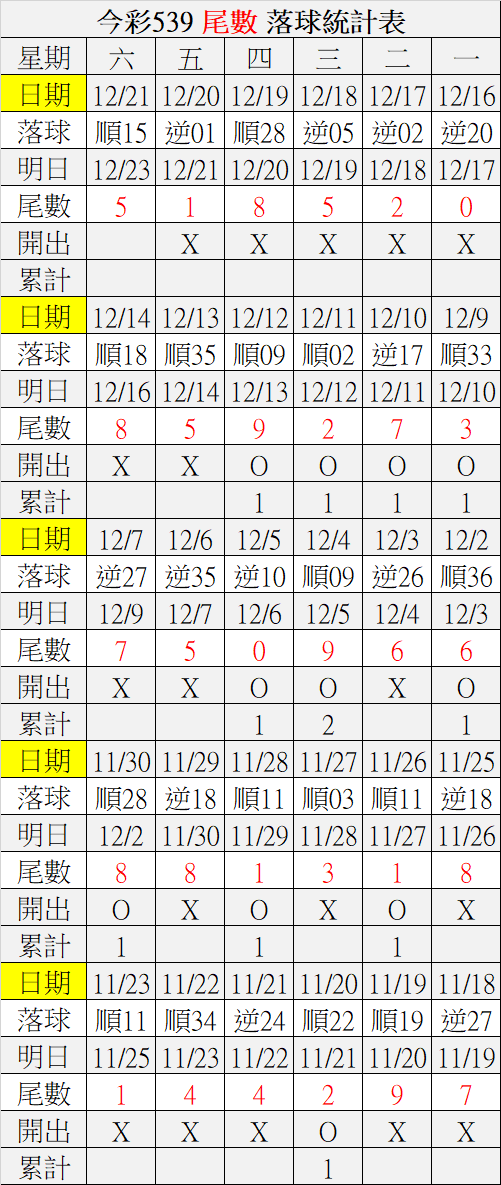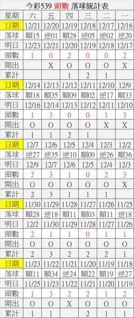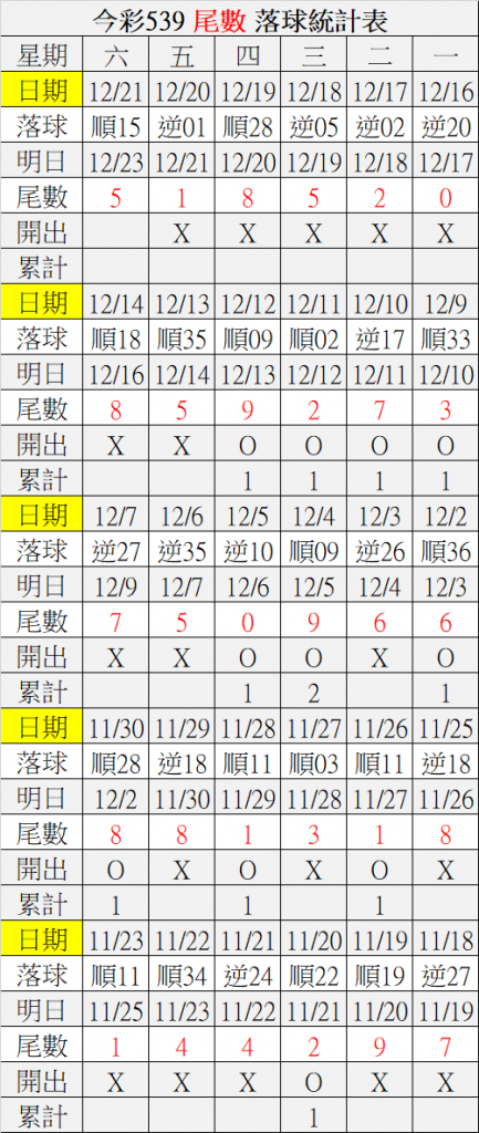 12/23 今彩539 落球順序表