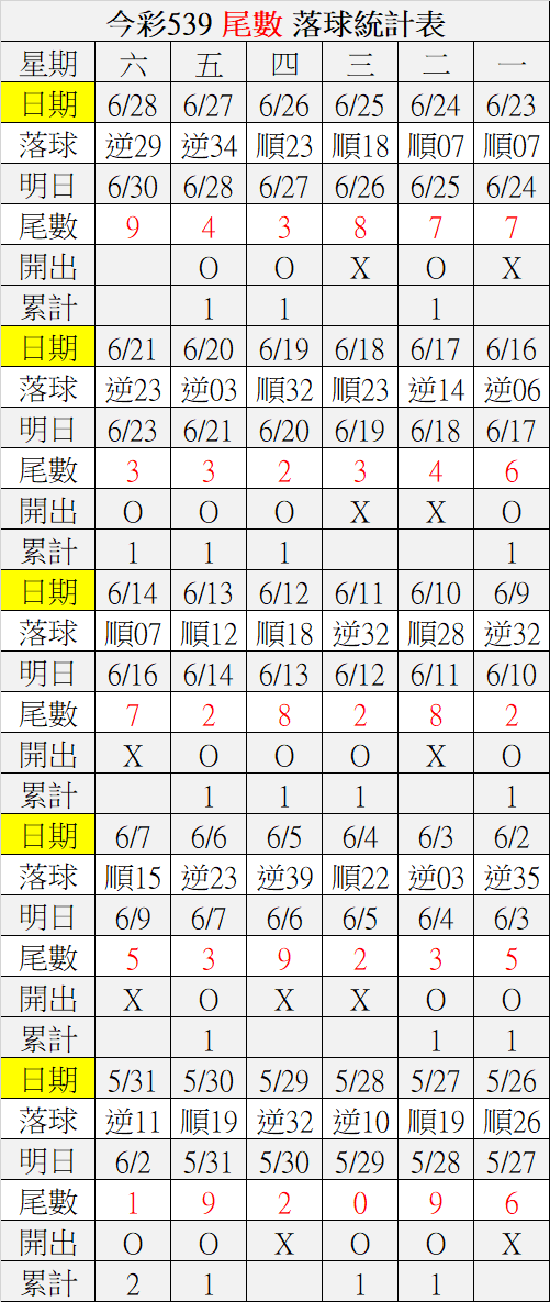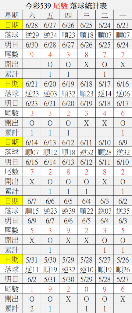 6/30 今彩539 落球順序表