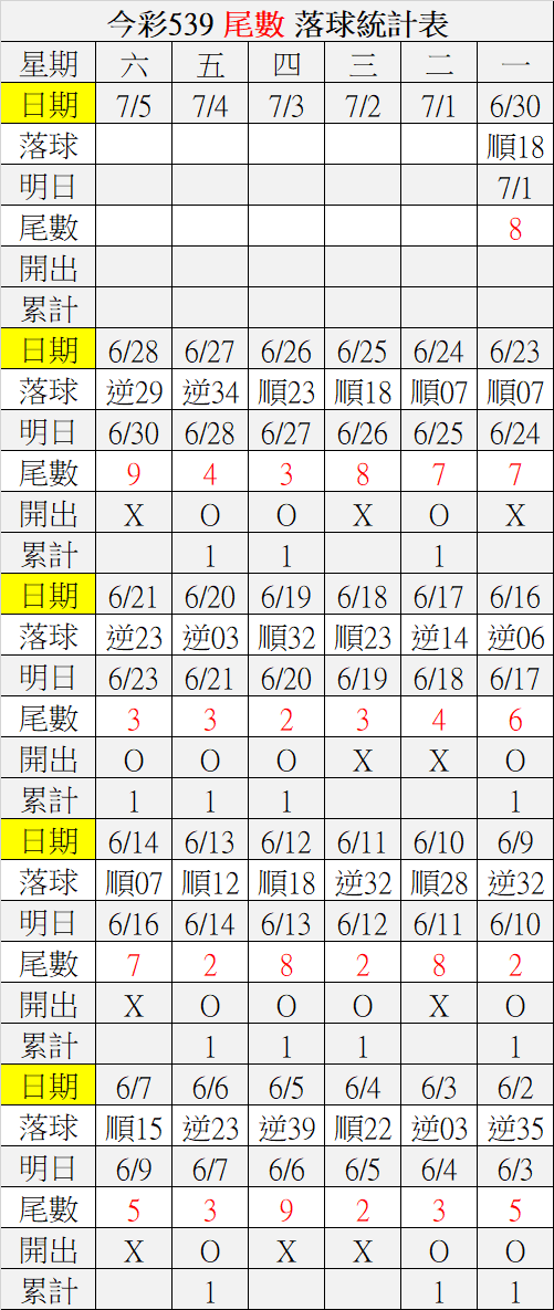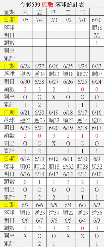 7/1 今彩539 落球順序表