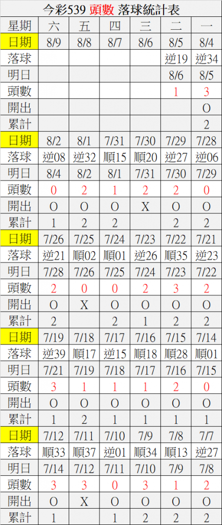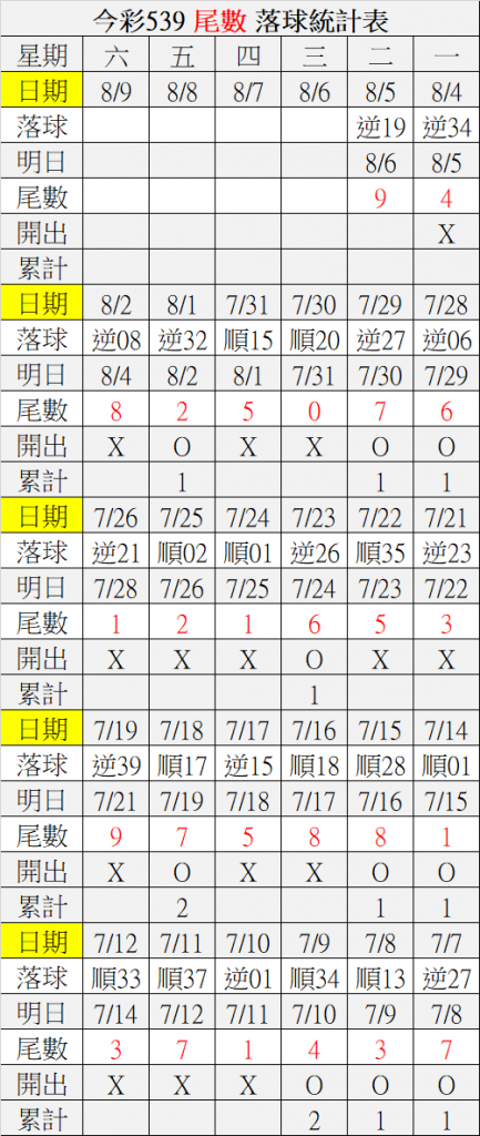 8/6 今彩539 落球順序表