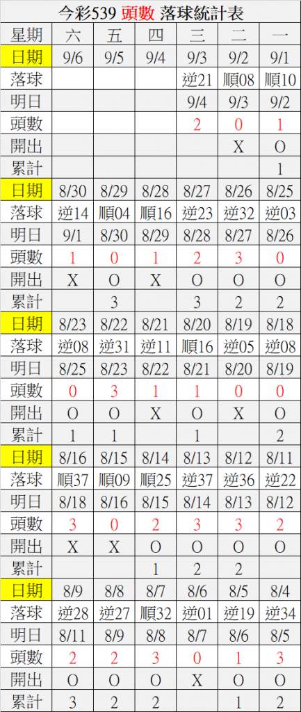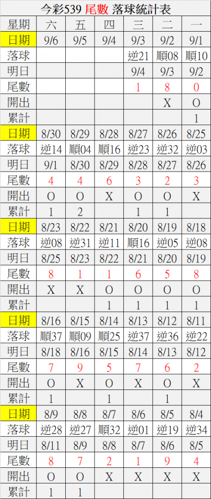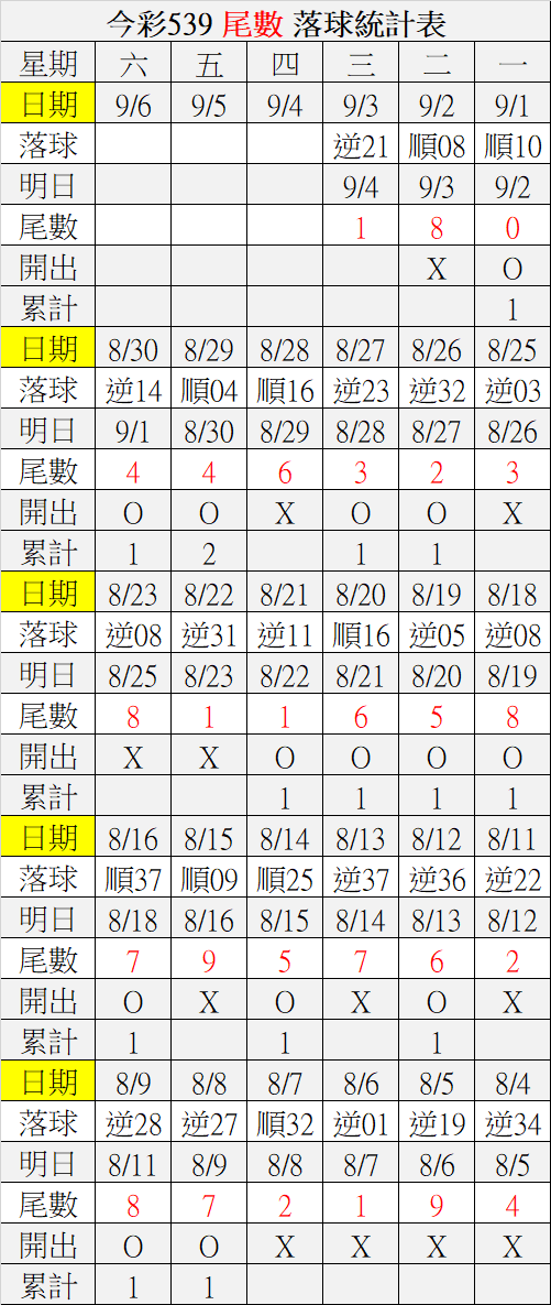 9/4 今彩539 落球順序表