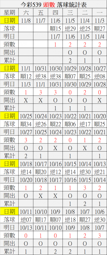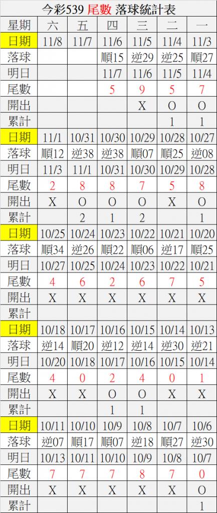 11/7 今彩539 落球順序表