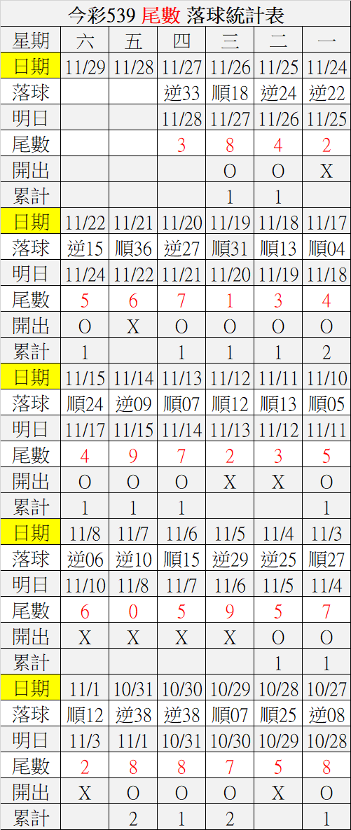 11/28 今彩539 落球順序表